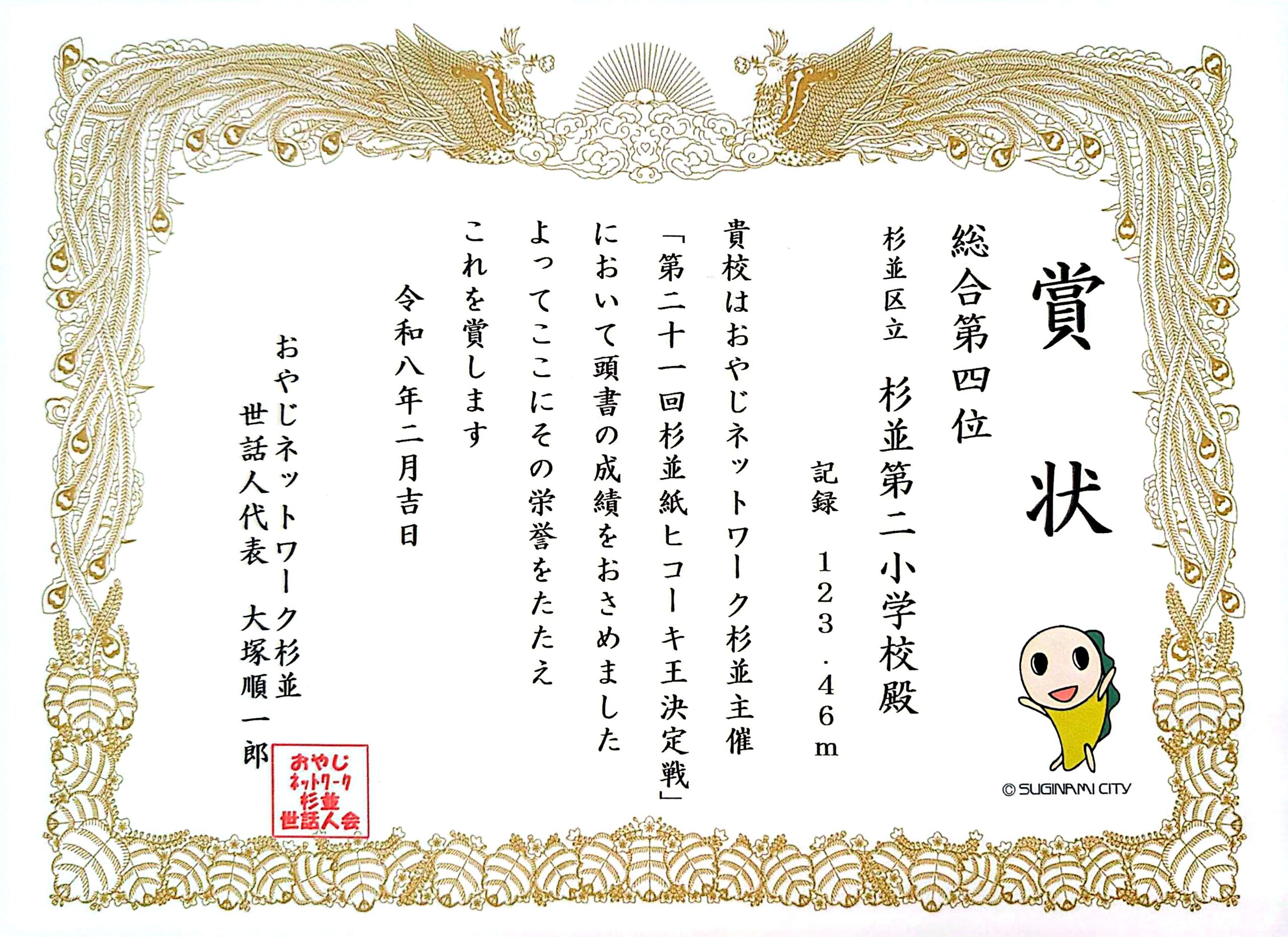 第21回杉並紙ヒコーキ王決定戦表彰式が開催されました。今回の結果は次のとおりでした。 《全体》 9校、306名が参加 《団体戦(上位10名の記録の合計)》 1位 桃二小 157.84m2位 永福小 143.15m3位 富 […] -