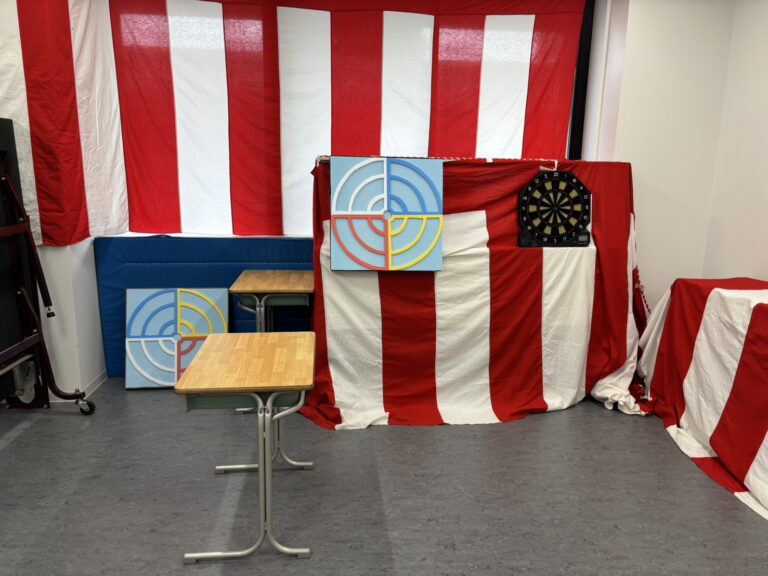 我々は、ゲームコーナーの「ボトルフリップ」(500mlペットボトルに150mlほどの色水を入れ、クルリと投げて30秒の中で何回立てられるかを競うゲーム)を担当しました。